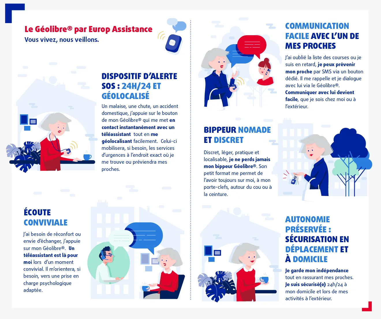 Après le Géophone et le Géoassist, Europ Assistance La Téléassistance, spécialiste de la téléassistance mobile géolocalisée avec GPS, lance une nouvelle solution innovante pour accompagner les seniors à leur domicile et à l’extérieur. Nommé « GÉOLIBRE® », ce produit vous permet de rester mobile et actif tout en conservant votre autonomie et indépendance; il vous sécurise au quotidien.